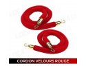 Cordon pour potelet en velours lisse rouge ou bleu avec deux embouts extrémités à mousquetons couleur or. À fixer sur un poteau de balisage à corde.